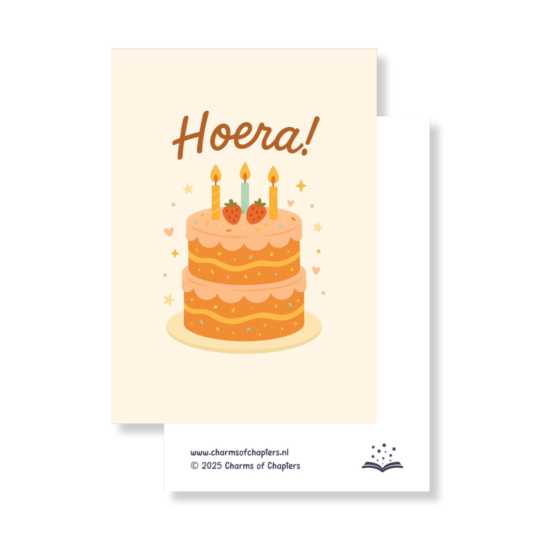 Hoera! Of het nu gaat om een verjaardag, diploma of ander feestje: deze vrolijke kaart zegt precies genoeg. Handgetekend, kleurrijk en feestelijk verpakt.