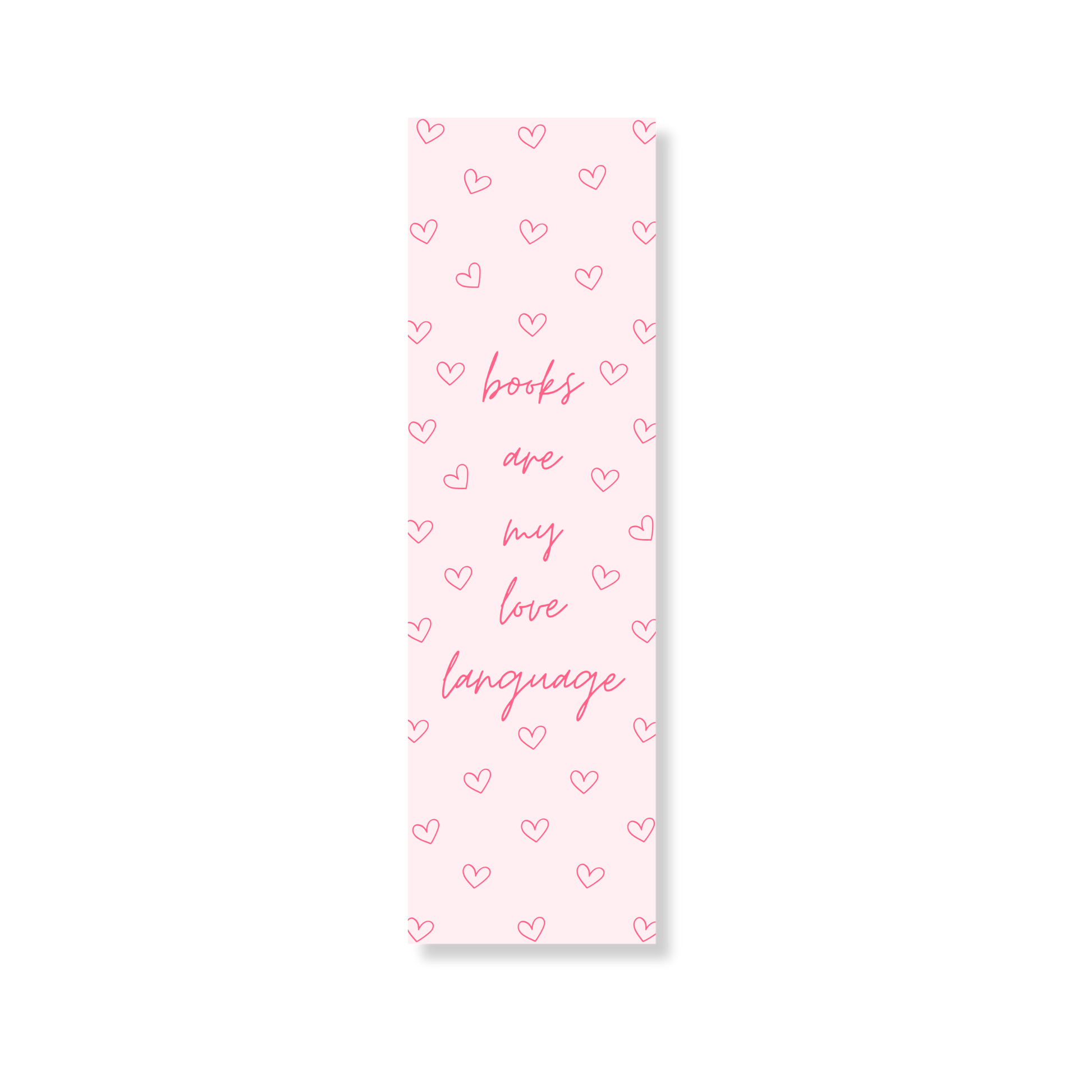Deze Books Are My Love Language boekenlegger (50x180mm) heeft een zachte roze achtergrond met speelse hartjes en een elegante quote, ideaal voor iedereen die boeken ziet als hun échte love language.