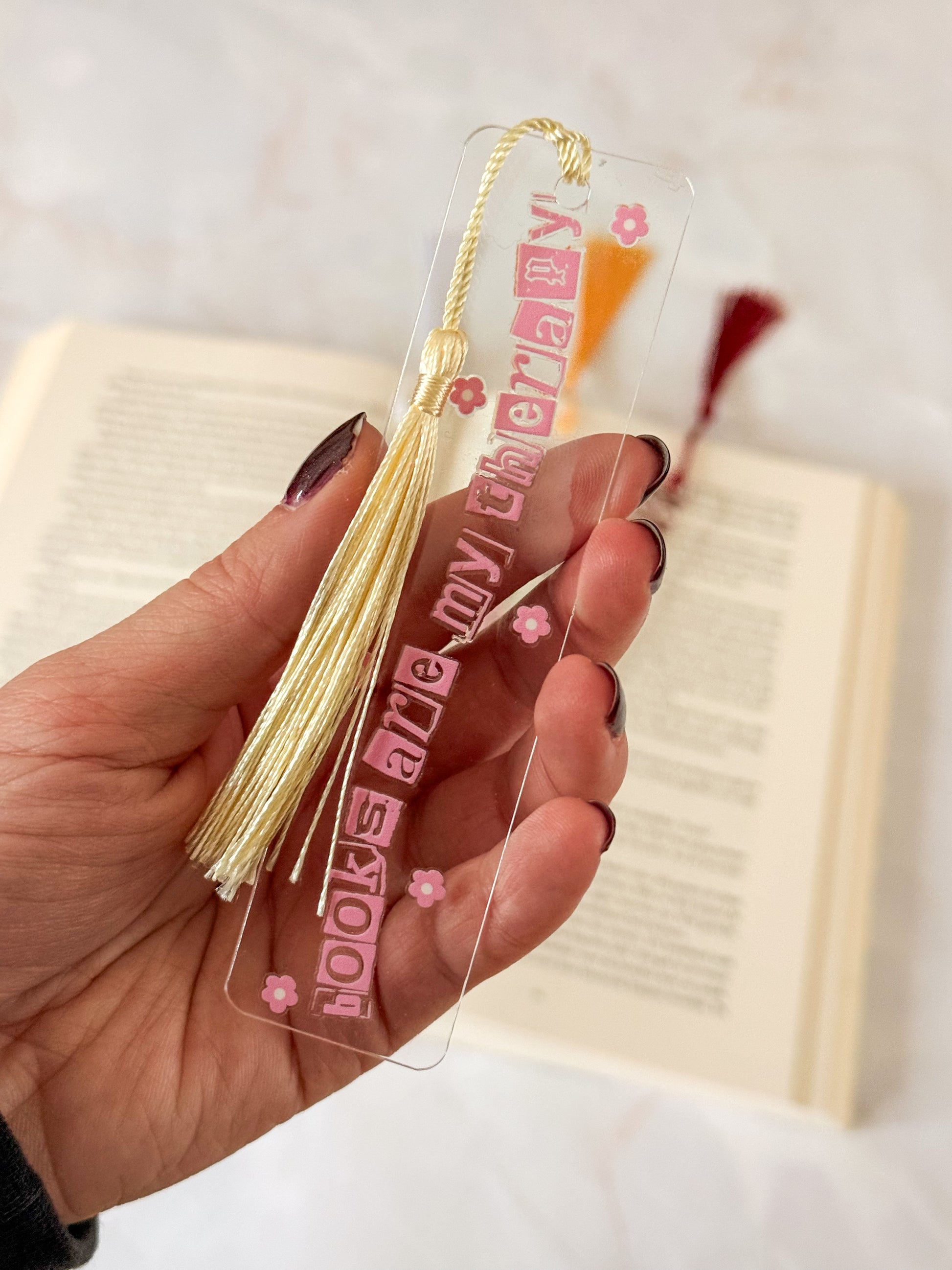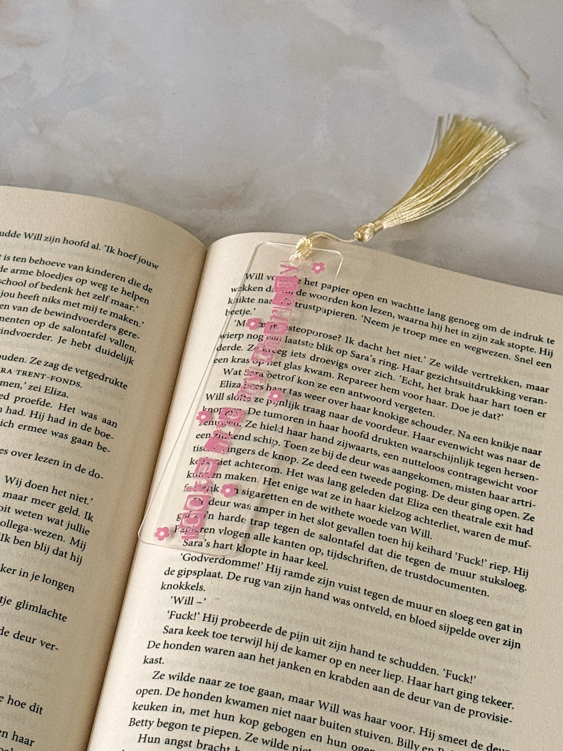 Voor de lezers die hun hoofd leegmaken tussen de pagina’s. Deze transparante acryl boekenlegger heeft speelse roze letters, schattige bloemetjes en een zacht champagne kleurig kwastje.