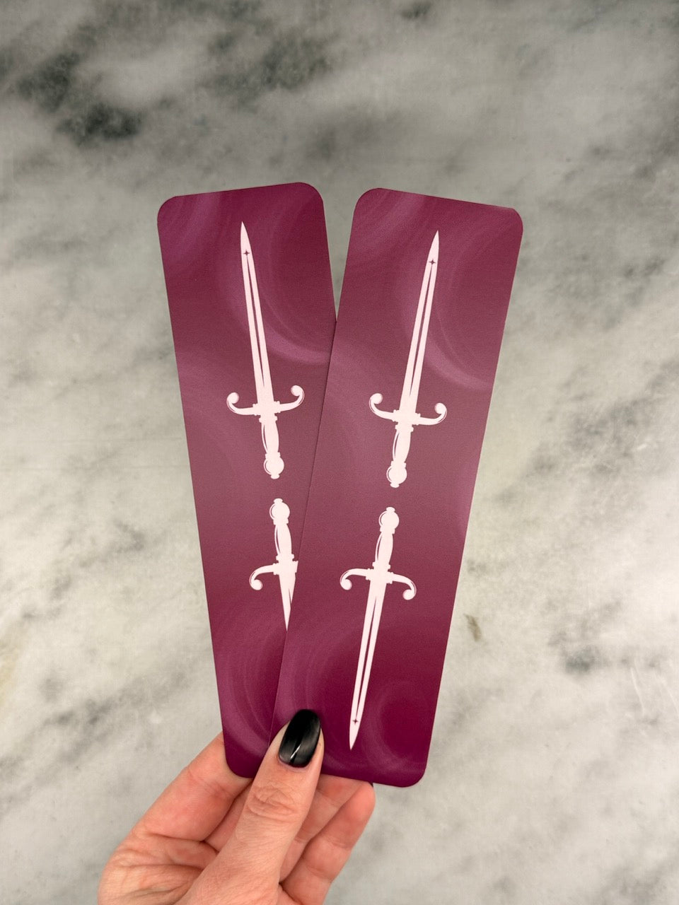 De Swords boekenlegger (50x180mm) heeft een diepe bordeauxrode achtergrond met sierlijke witte zwaarden, perfect voor fans van romantasy, high fantasy en avontuurlijke verhalen.