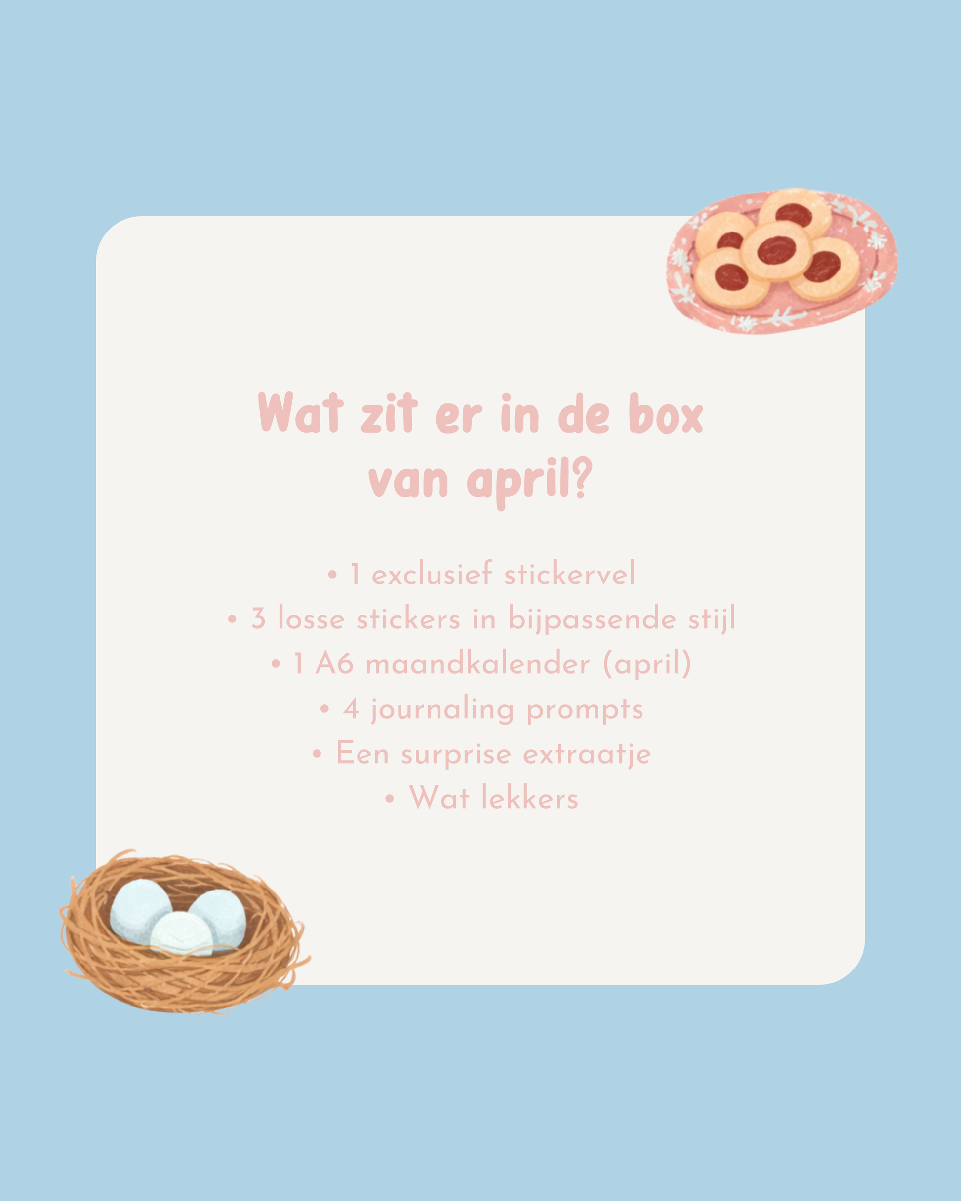 De maandelijkse journal boxen sluiten aan bij het ritme van het jaar. Elke editie is afgestemd op de betreffende maand en bevat items die passen bij het seizoen, de sfeer en de energie van dat moment. Zo geef je jouw journal elke maand een nieuwe start, zonder dat je zelf hoeft te zoeken naar bijpassende spullen.